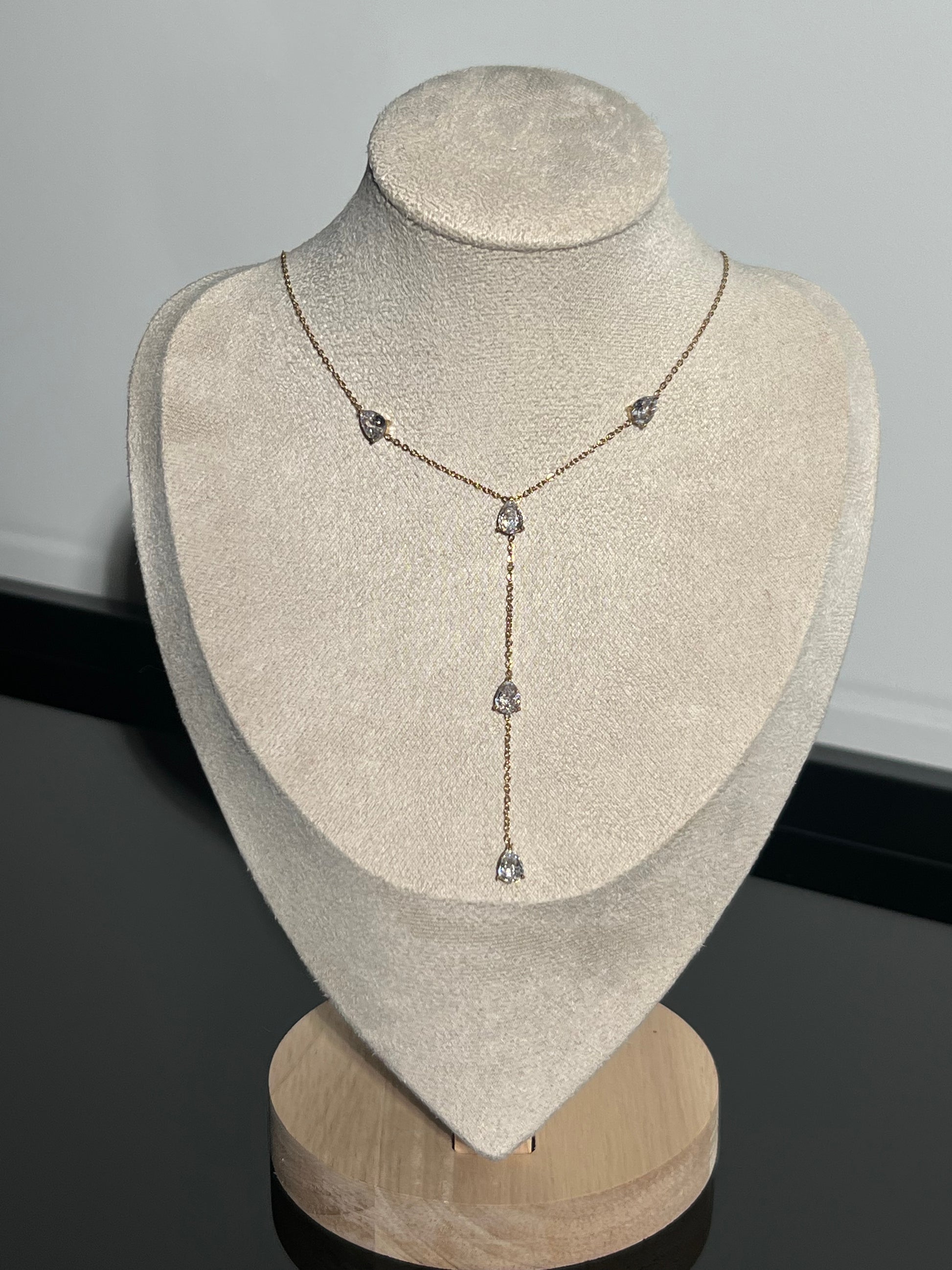 Un collier Y délicat, doré et orné de gouttes scintillantes 💧✨.