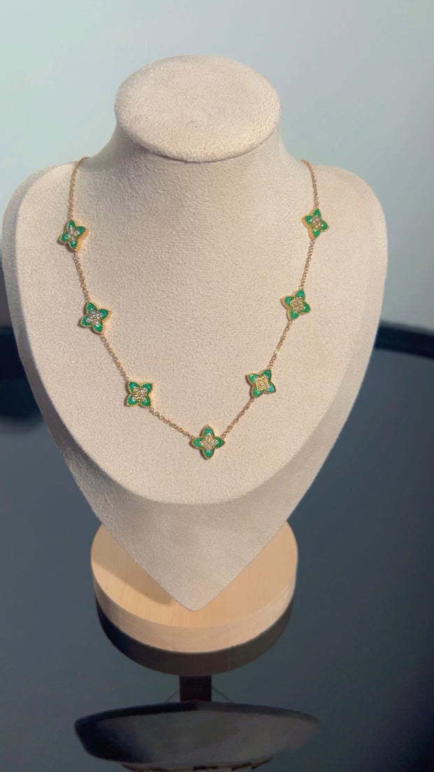 Le collier Fleur d’Émeraude met en valeur sept trèfles vert intense, montés sur une fine chaîne dorée. Un bijou chic et moderne, parfait pour sublimer toutes tes tenues — du quotidien aux soirées.