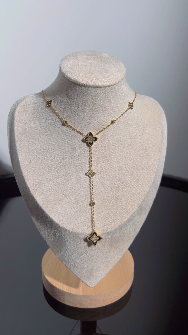 Un collier Y doré aux motifs floraux raffinés, sublimés par une rivière de diamant.